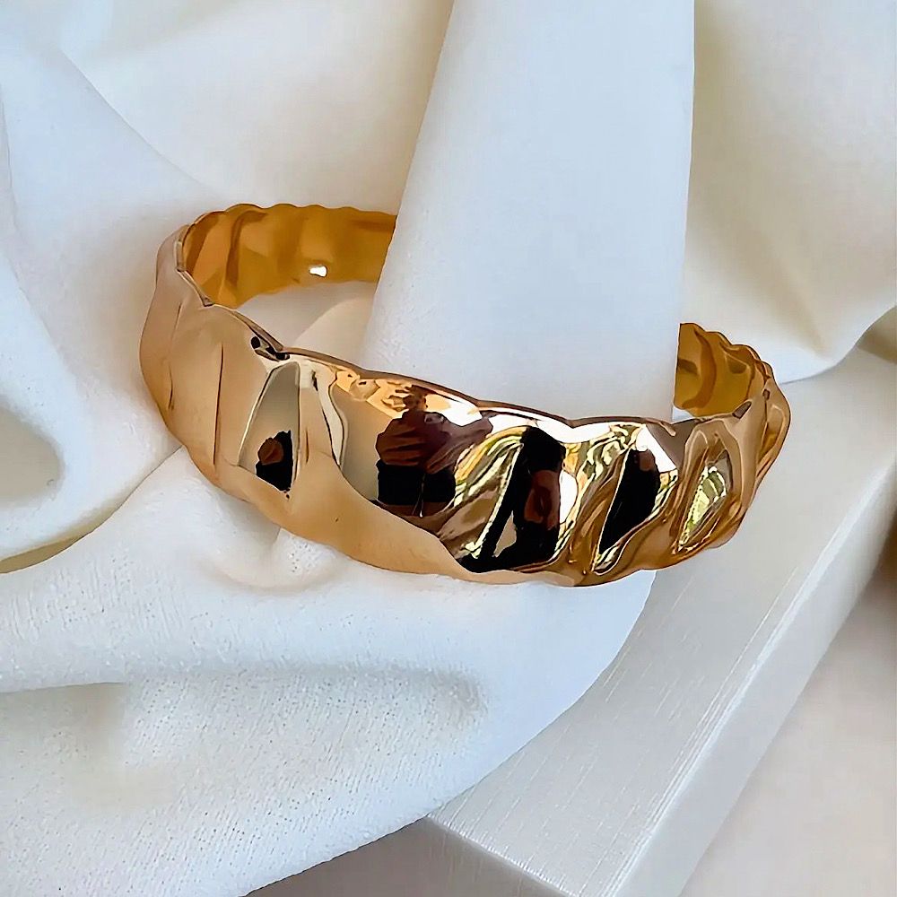 Bracelete Martelado Cory Banhado a Ouro 18k. O Bracelete Cory é a expressão perfeita da elegância contemporânea com personalidade marcante. Seu design martelado cria um jogo de luz sofisticado, onde cada relevo reflete o brilho do ouro de forma única, valorizando o pulso com imponência e estilo. Com acabamento polido e formas orgânicas, essa joia transmite força e sofisticação ao mesmo tempo, sendo ideal para quem busca um acessório impactante, moderno e atemporal. O banho em Ouro 18k garante um tom dourado intenso e luxuoso, elevando qualquer produção — do look minimalista ao mais elaborado. Uma peça statement, pensada para mulheres que apreciam design exclusivo, presença e elegância em cada detalhe.