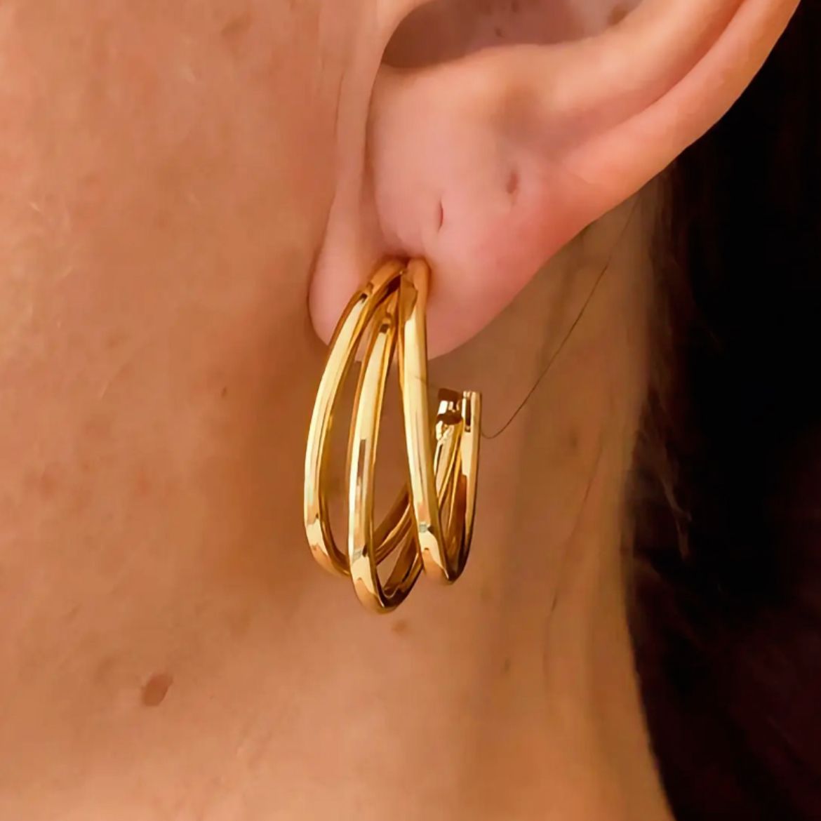 Brinco de Argola 3 fios Liso Iris banhado a Ouro 18k. O Brinco Íris traduz sofisticação em sua forma mais pura. Seu design em três fios lisos paralelos cria um efeito visual marcante e elegante, conferindo volume equilibrado e um acabamento extremamente refinado. A composição minimalista valoriza o brilho do metal, tornando a peça atemporal e versátil. Com linhas limpas e superfície polida, o modelo Íris reflete a luz de maneira intensa e uniforme, elevando qualquer produção com um toque de luxo discreto. É a escolha ideal para quem busca uma argola moderna, imponente na medida certa e fácil de combinar tanto em looks clássicos quanto contemporâneos. Banhado a Ouro 18k, o brinco apresenta brilho duradouro, resistência e um acabamento premium que reforça sua estética sofisticada.