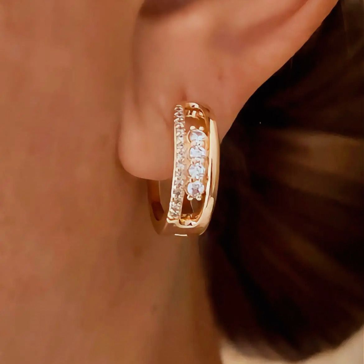 Brinco de Argola Luxo Cristais Atena Banhado a Ouro 18k. O Brinco de Argola Atena é a definição perfeita de elegância com brilho na medida certa. Seu design sofisticado combina o acabamento polido do banho em ouro 18k com uma fileira de cristais delicadamente cravejados, que refletem a luz de forma intensa e refinada. Ideal para quem ama acessórios luxuosos, mas versáteis, ele transita facilmente do dia para a noite, valorizando qualquer produção — das mais básicas às mais elaboradas.