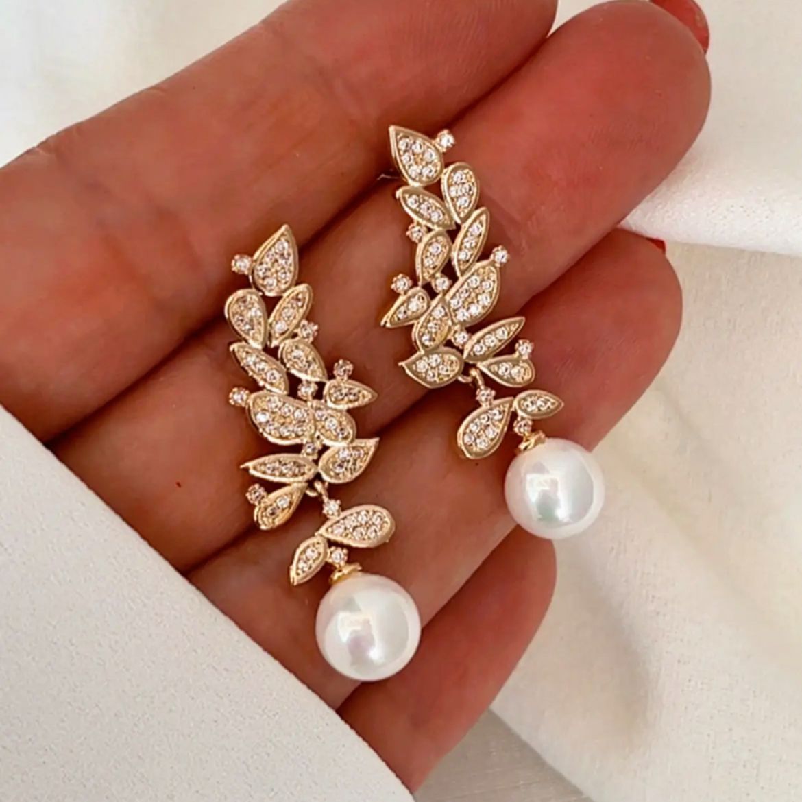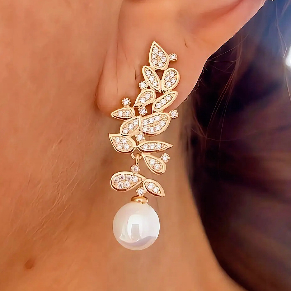 Brinco Pérola Ramos em Cristais Banhado a Ouro 18k. O Brinco Pérola Ramos em Cristais Banhado a Ouro 18k é uma peça que une delicadeza, brilho e elegância em um design rico em detalhes. Seu formato inspirado em ramos delicados cria um desenho orgânico e sofisticado, composto por pequenas folhas contornadas em ouro e inteiramente cravejadas com cristais que refletem a luz de maneira deslumbrante. Cada folha parece formar um movimento suave e natural, criando um efeito visual leve e fluido, como se o brinco acompanhasse o balanço sutil do corpo. Na extremidade de cada peça, uma pérola clássica adiciona um toque de tradição e refinamento, equilibrando o brilho dos cristais com sua superfície lisa e elegante. O banho em Ouro 18k destaca ainda mais o contraste entre o dourado e o branco das pérolas e cristais, tornando o brinco perfeito para ocasiões especiais, festas e produções sofisticadas. É uma joia que transmite romantismo e presença, ideal para quem busca um acessório exuberante, harmonioso e atemporal.