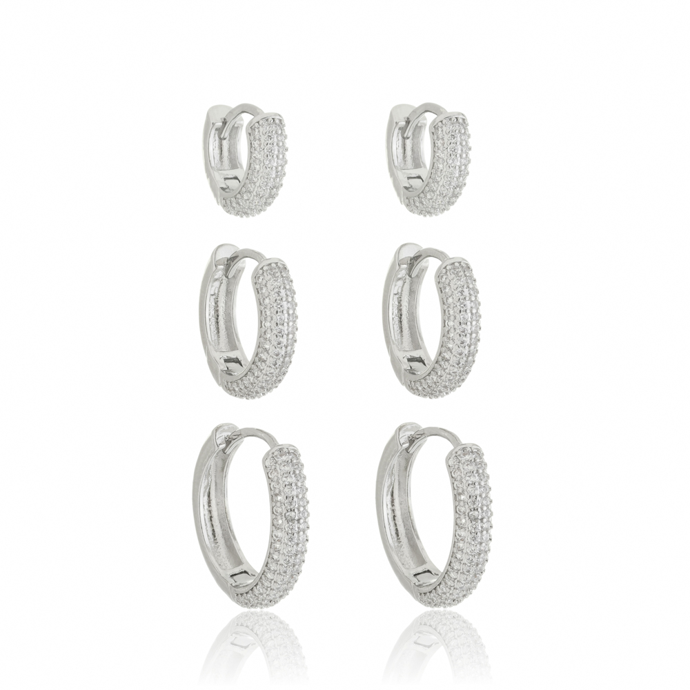 Brinco Trio de Argola Crav Ródio Branco. O Brinco Trio é simplesmente perfeito, dá um charme da orelha, ideal para mulheres que gostam de acessórios com estilo e personalidade. O kit é composto por 3 pares de argolas no Banho de Ródio e todos cravados com zircônias, tem um brilho incrível e desperta olhares por onde passa. Use e sinta-se linda! Semijoia com verniz especial que garante brilho e durabilidade. Garantia de 6 meses quanto ao banho, desenvolvido com tecnologia hipoalergênica.