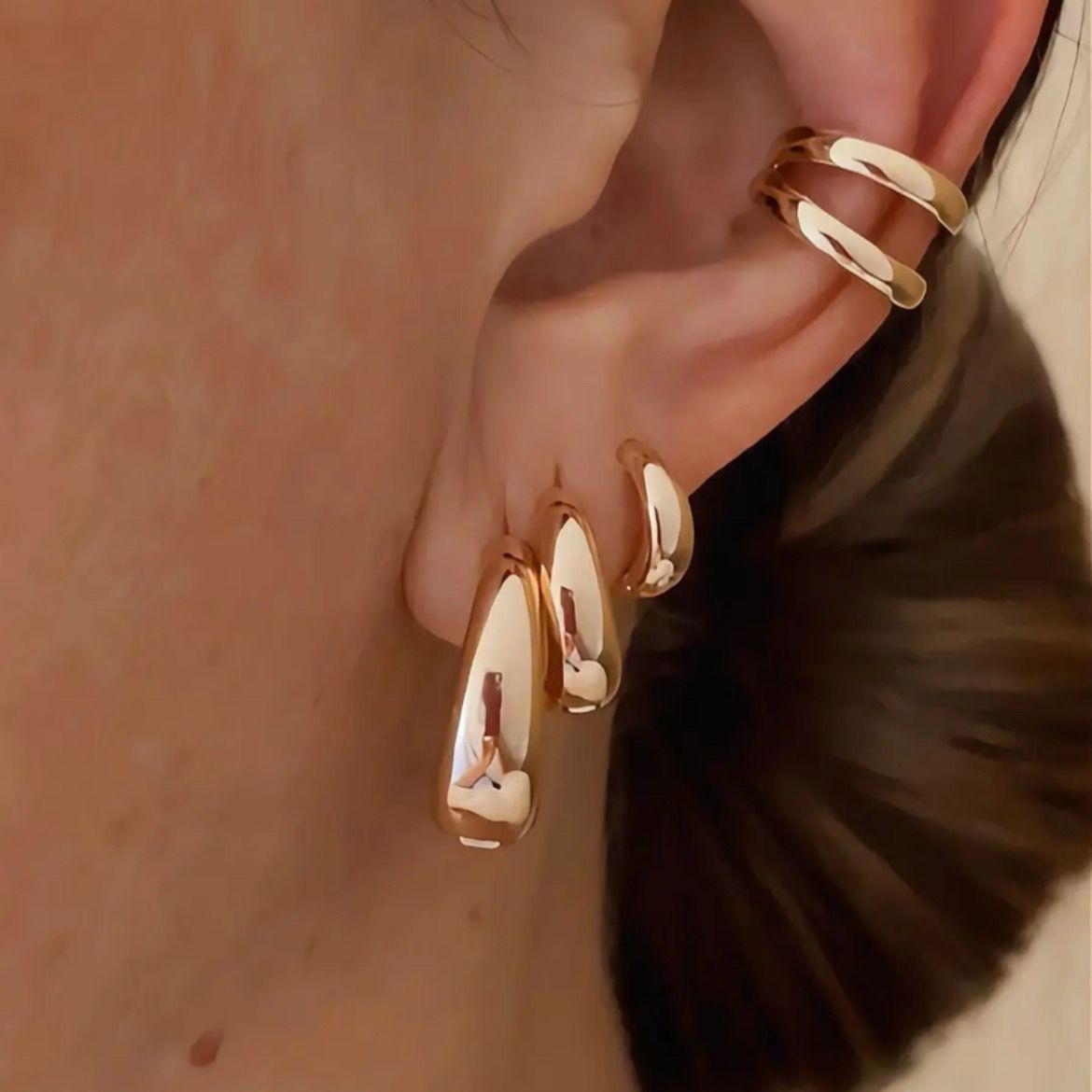 Brinco Trio de argolas Bold Tryce Class Banhado a Ouro 18k. Imponente na medida certa, o Trio de Argolas Bold Tryce Class traduz a elegância contemporânea em um design marcante e sofisticado. Com volumes harmoniosos e acabamento espelhado, cada argola foi pensada para valorizar o brilho do ouro e criar um efeito visual poderoso, que eleva qualquer produção com personalidade e classe. Versátil e atemporal, o trio permite composições modernas — do uso individual, para um visual minimal chic, ao mix completo, que imprime presença e sofisticação imediata. Uma joia que reflete força, estilo e refinamento em cada detalhe, ideal para mulheres que apreciam design autoral e impacto visual com elegância.