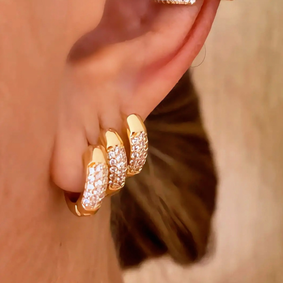 Brinco Trio de Argolas Mini Glow Banhado a Ouro 18k. O Brinco Trio de Argolas Mini Glow traduz o luxo na sua forma mais delicada. Com design moderno e acabamento impecável, cada argola é cuidadosamente cravejada com micro cristais que refletem a luz de maneira intensa e sofisticada, criando um efeito luminoso contínuo e extremamente elegante. O formato levemente robusto, aliado ao brilho uniforme dos cristais, confere presença e refinamento na medida certa. O trio em tamanhos graduais permite composições versáteis — do visual minimalista ao mix mais glamouroso — valorizando a orelha com um toque contemporâneo e luxuoso. Banhado a Ouro 18k, é uma joia pensada para quem aprecia detalhes, acabamento premium e brilho que se destaca com sutileza.