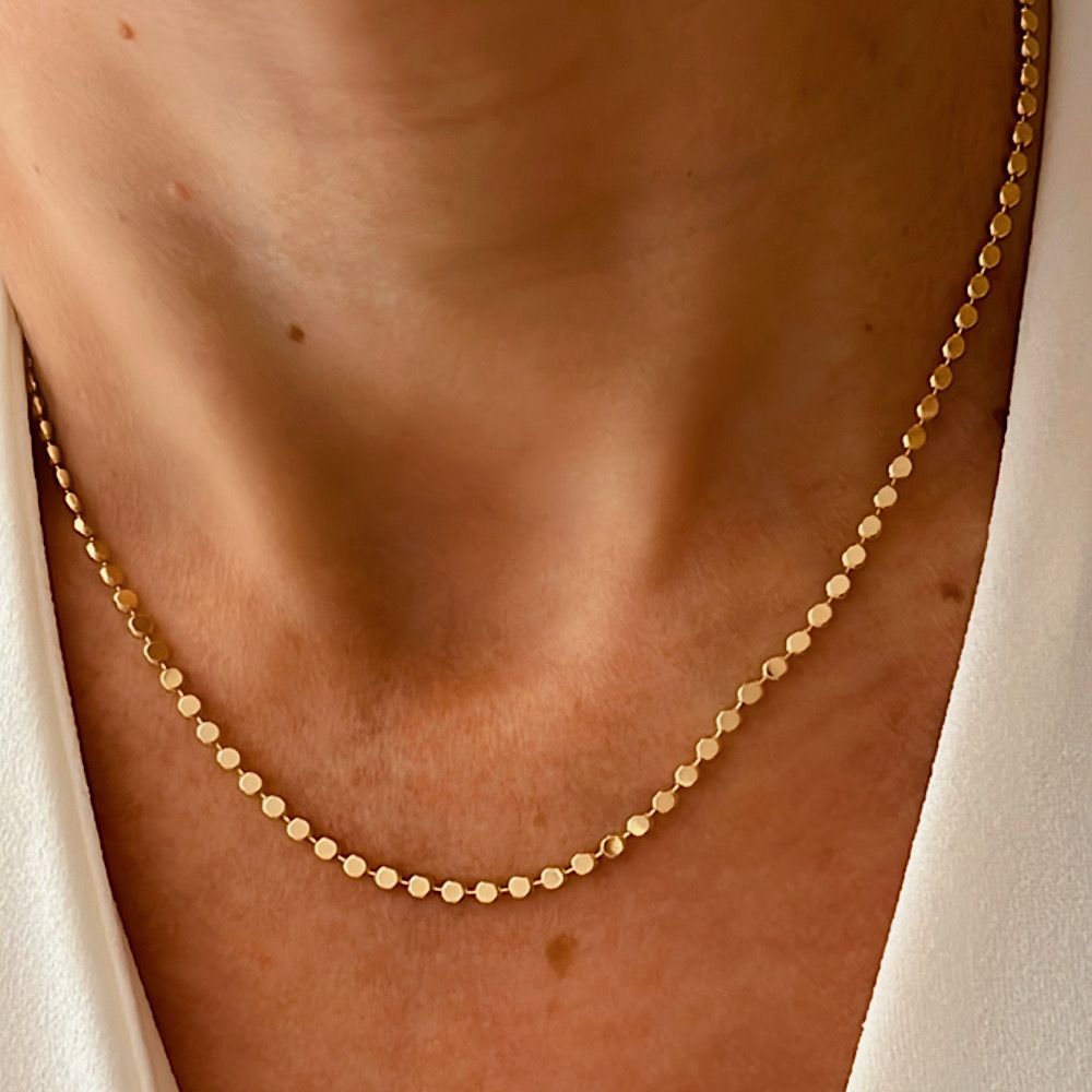 Choker Maxi Bolinhas Achatadas Banhado a ouro 18k. A Choker Maxi Bolinhas Achatadas é a definição perfeita de elegância moderna com um toque de ousadia. Seu design é composto por esferas achatadas e polidas, delicadamente interligadas, que refletem a luz de forma suave e contínua, criando um brilho sofisticado que valoriza o colo e o contorno do pescoço. Com acabamento impecável e banho de Ouro 18K, esta peça se destaca pela textura lisa e pelo movimento fluido das bolinhas — uma combinação que confere tanto leveza quanto presença. Ideal para ser usada sozinha, como protagonista do look, ou em composições com outros colares finos para um visual de camadas luxuosas e contemporâneas. Perfeita para quem busca uma joia versátil, que transita facilmente entre o casual e o sofisticado, mantendo sempre um ar de exclusividade.