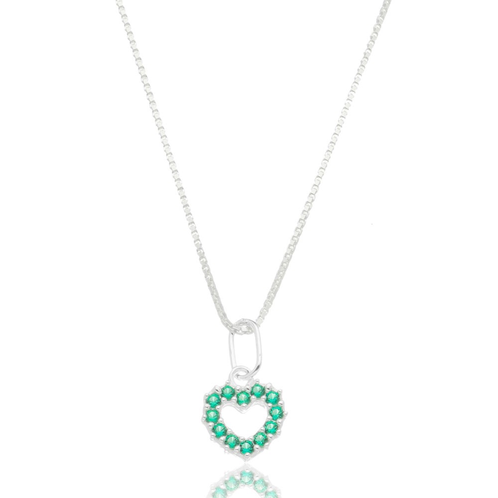 Colar Coração Vazado Cravejado Verde Prata 925. Esse colar é uma verdadeira joia! O acabamento é perfeito, beleza em todos os detalhes e o ponto alto são as zircônias no tom verde deslumbrante, você vai se apaixonar! Delicado e cheio de charme, fica lindo se usar com uma choker. Aproveite e arrase nos acessórios! Garantia de 6 meses quanto ao banho, desenvolvido com tecnologia hipoalergênica.